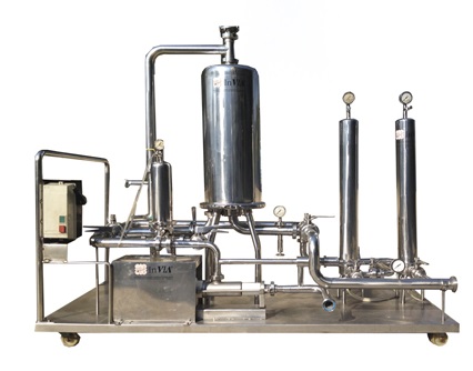 Cada una de las campanas de la bancada lleva en su interior un cartucho. Este proceso se realiza en continuo de modo que el aceite pasa directamente del filtro a la botella en un circuito cerrado esterilizado previamente con agua fría (para evitar la colmatación en los cartuchos de proteínas y otros elementos) y posteriormente con agua caliente a 125ºC durante 20 minutos generada en depósitos de calentamiento de agua o vapor de agua proveniente de generadores de vapor.