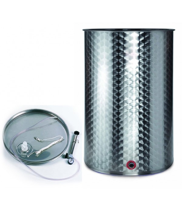 Ils sont utilisés de manière interchangeable pour le stockage ou la fermentation. Réservoir en acier inoxydable avec fond plat et couvercle de fermeture pneumatique (toujours plein). Le kit pneumatique se compose d'un couvercle en acier INOX, d'une chambre en plastique, d'un cylindre avec manomètre et d'une valve en plastique à double action. Robinet INOX inclus